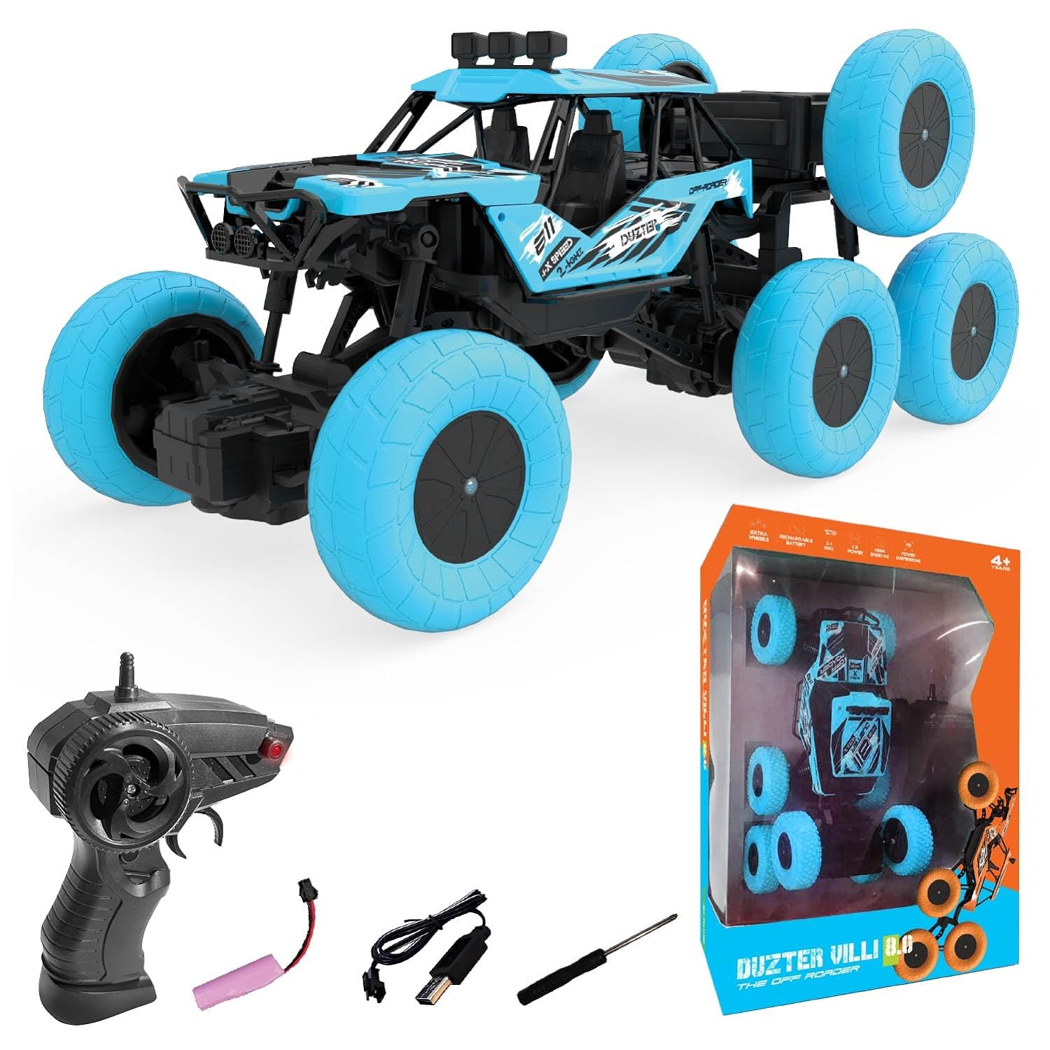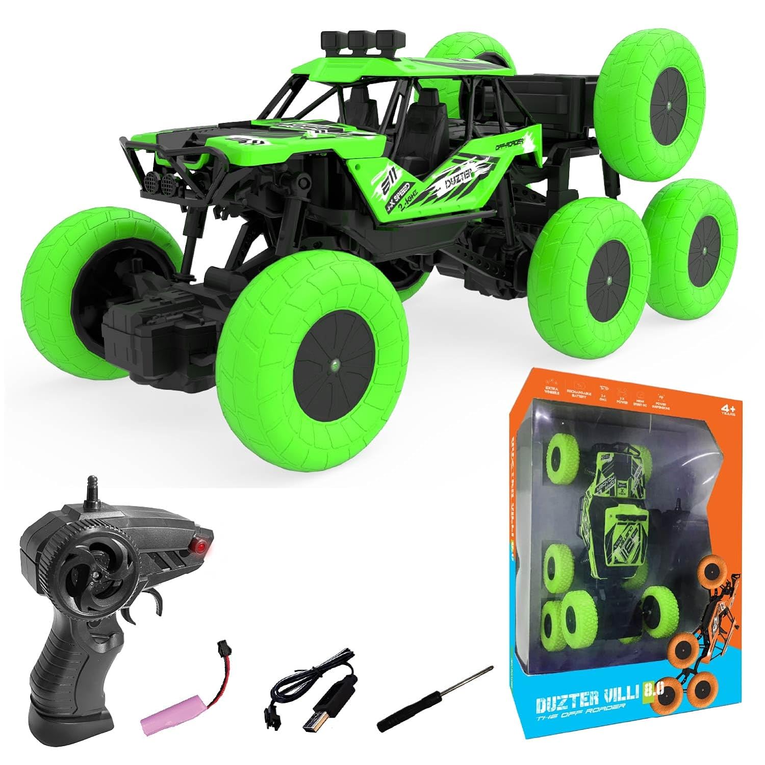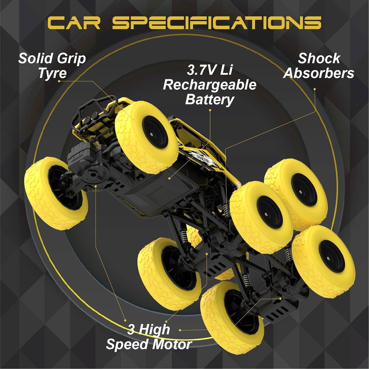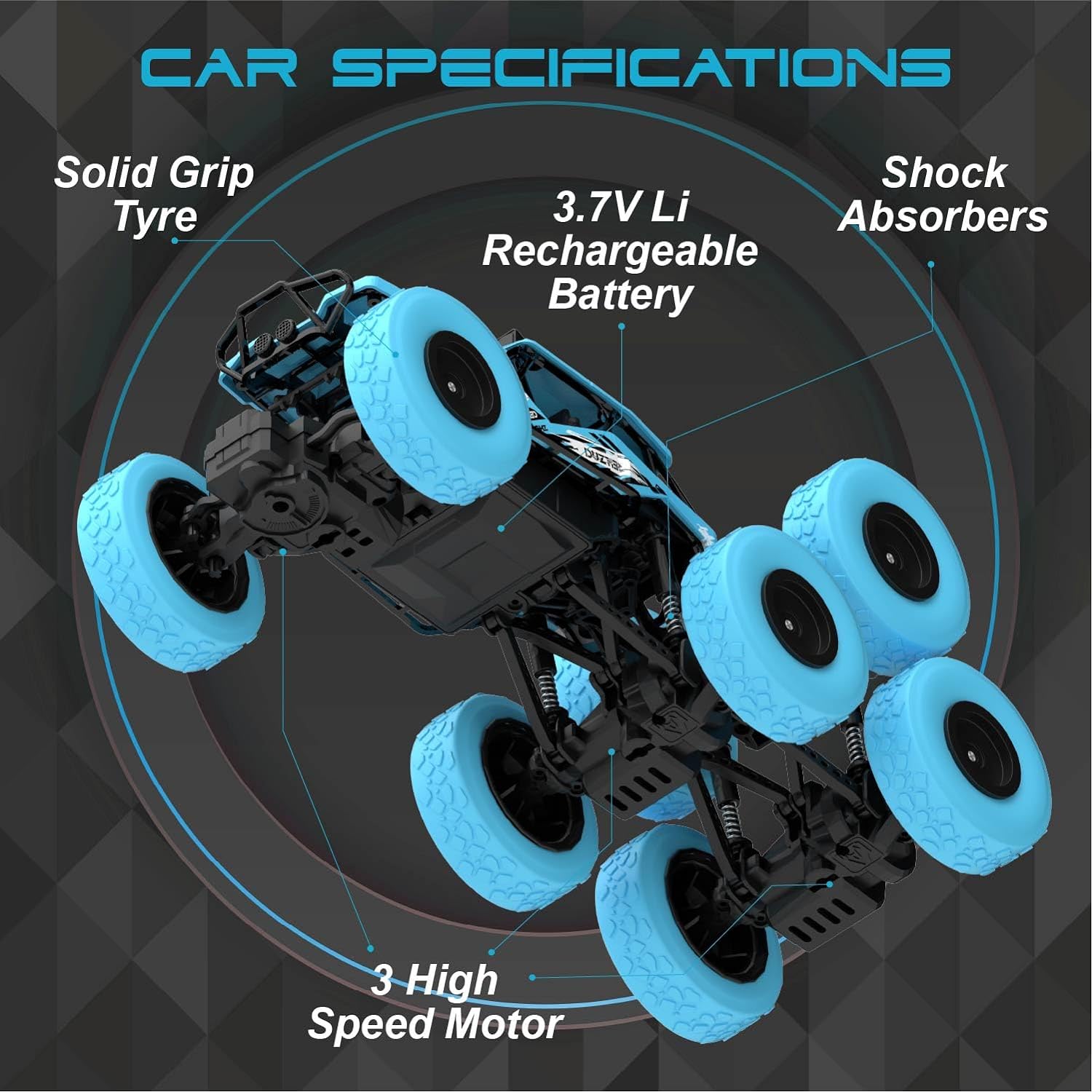 The high-quality shock absorbers minimizes the vibration and increase the lifespan of the inner components. Equipped with 2.4Ghz Radio Gun-Type Remote Control, which supports multiple cars racing at the same time without interference. Each wheel can move independently, which increases the flexibility when the car is driving upstairs or on slopes. It's so easy to control all the functions of forward/backward/turn left/turn right/climb/horizontal left drift/horizontal right drift. Each wheel with a stable and shockproof spring that provides support for unexpected falls and the unstable surface of the ground, makes you enjoy the all-terrain vehicle for a longer period of time.